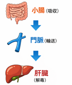 小腸(吸収)→門脈(搬送)→肝臓(仕分け・解毒・抱合)